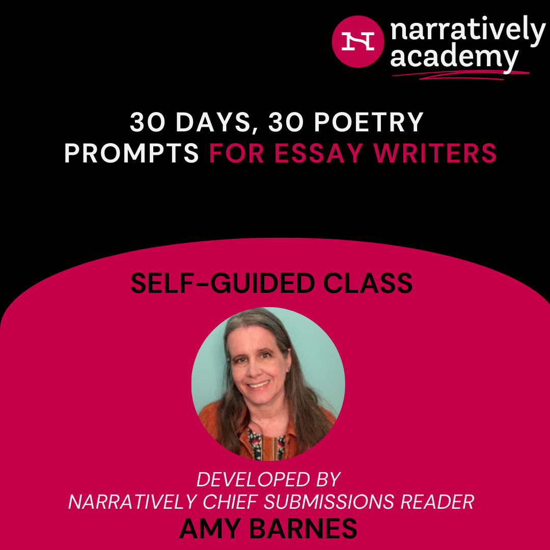 Prose and poetry have a lot in common, and essayists in particular can learn a lot from poets. Developed by Narratively Chief Submissions Reader Amy Barnes, this fun and inspiring self-guided course is designed to help you break through writer’s block and figure out how to put your unique life experiences into words—with a little help from some of the world’s best poets. Each day we’ll share a poem or two on a theme, along with a quick prompt to help you get started on your own writing. Throughout the month, you’ll learn how to use poetry poetry as a jumping-off point to inspire your essays. Poems presented in the course will explore mostly contemporary poetry, on a variety of themes and topics, chosen to inspire class members in essay and memoir writing.