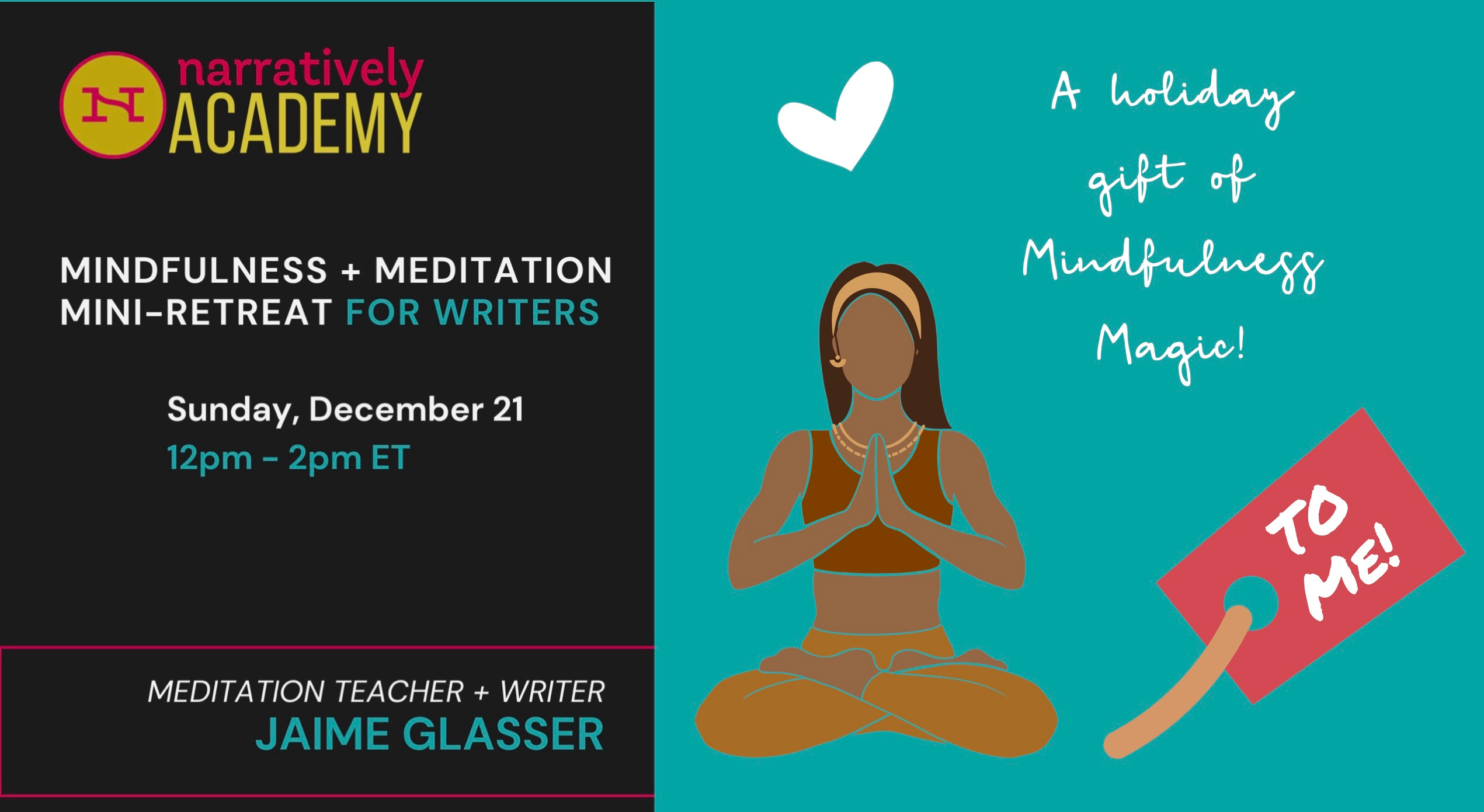 , a certified mindfulness teacher and writer, and held on Zoom, this fun and inspiring session is designed to affirm your creativity and offer tools to support joy, kindness and ease in your writing, even on difficult days. If you’re feeling stuck in your writing, or unsure what direction to take it in the new year, this one is for you.Jaime led our first-ever mindfulness mini-retreat this fall, and attendees were unanimously over the moon about how much they got out of this session. She’ll start with an introduction to mindfulness and why it can be a supportive partner in the writing process. Next Jaime will facilitate a guided meditation to promote a positive mindset and prepare you to write. Then you’ll respond to a prompt and generate an understanding of your perceived obstacles and the unique qualities you possess to overcome them. We’ll next break into small peer support circles where you’ll have the opportunity to share your personal discoveries. Finally, we’ll close with an opportunity to share the small groups’ revelations with the whole cohort, and examine how to incorporate all of our takeaways into our individual writing practices.