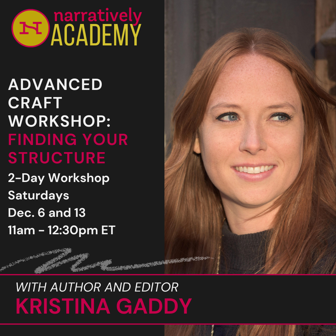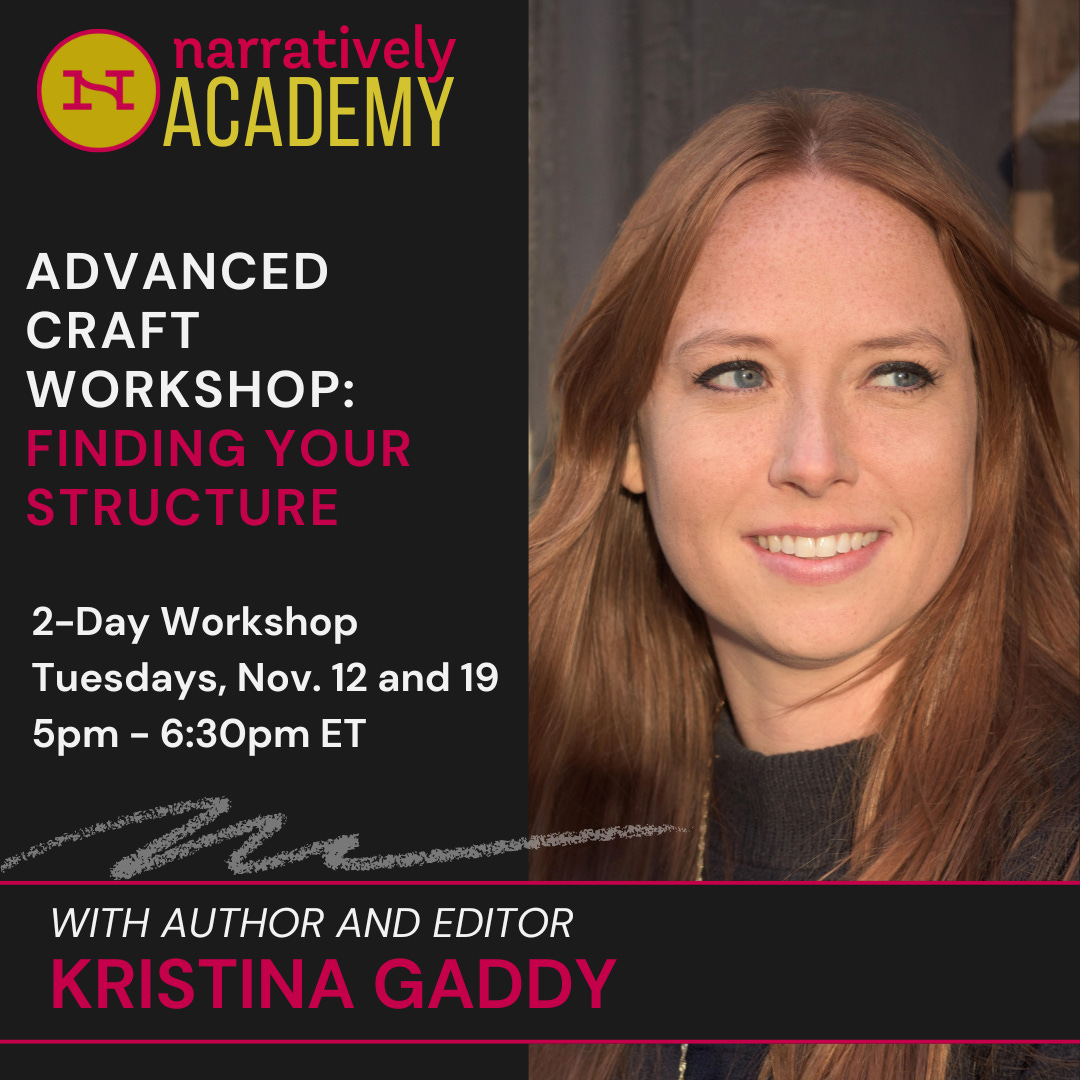 In this intimate two-part workshop, author Kristina Gaddy will lead students in examining the ways that top nonfiction and memoir writers structure their work in both conventional and unconventional ways. While non-traditional structures can often be complicated, sometimes with the right scaffolding, a piece actually becomes easier to write, revise, and understand.