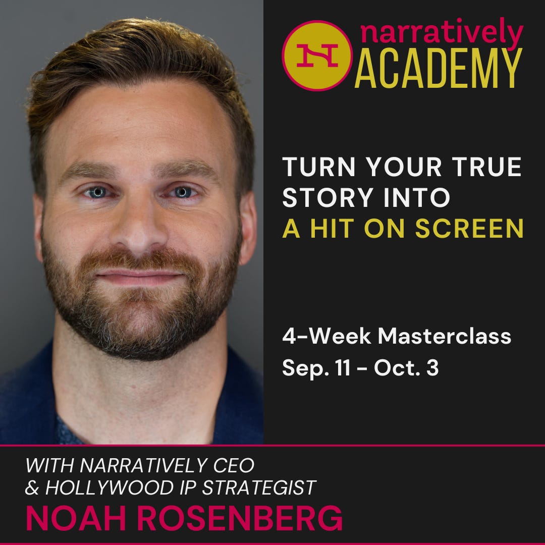 If you’ve ever thought your life story—or a story you’ve written or hope to tell—belongs on screen, this first class is for you. Hollywood is in a golden age of demand for true stories, and this 4-part masterclass is your insider’s guide to seizing the opportunity. Narratively Co-Founder & CEO Noah Rosenberg adapted his own memoir piece into a scripted series developed with Warner Bros. and Robert Zemeckis, and has led dozens of story-to-screen deals with Amazon, Universal, Lionsgate, and partners like LeBron James and Emma Roberts. In this very special class, he’ll pull back the curtain on how the adaptation process really works—alongside top development execs, producers, and screenwriters who will share exactly what they look for in nonfiction IP, and how you can take advantage of this moment.
