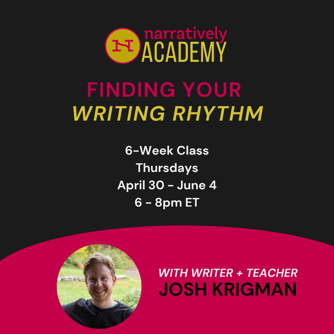 This 6-week class takes place on Thursdays from 6pm to 8pm ET, starting on April 30 and ending on June 4. All Narratively Academy classes are conducted online and accessible to students anywhere in the world.