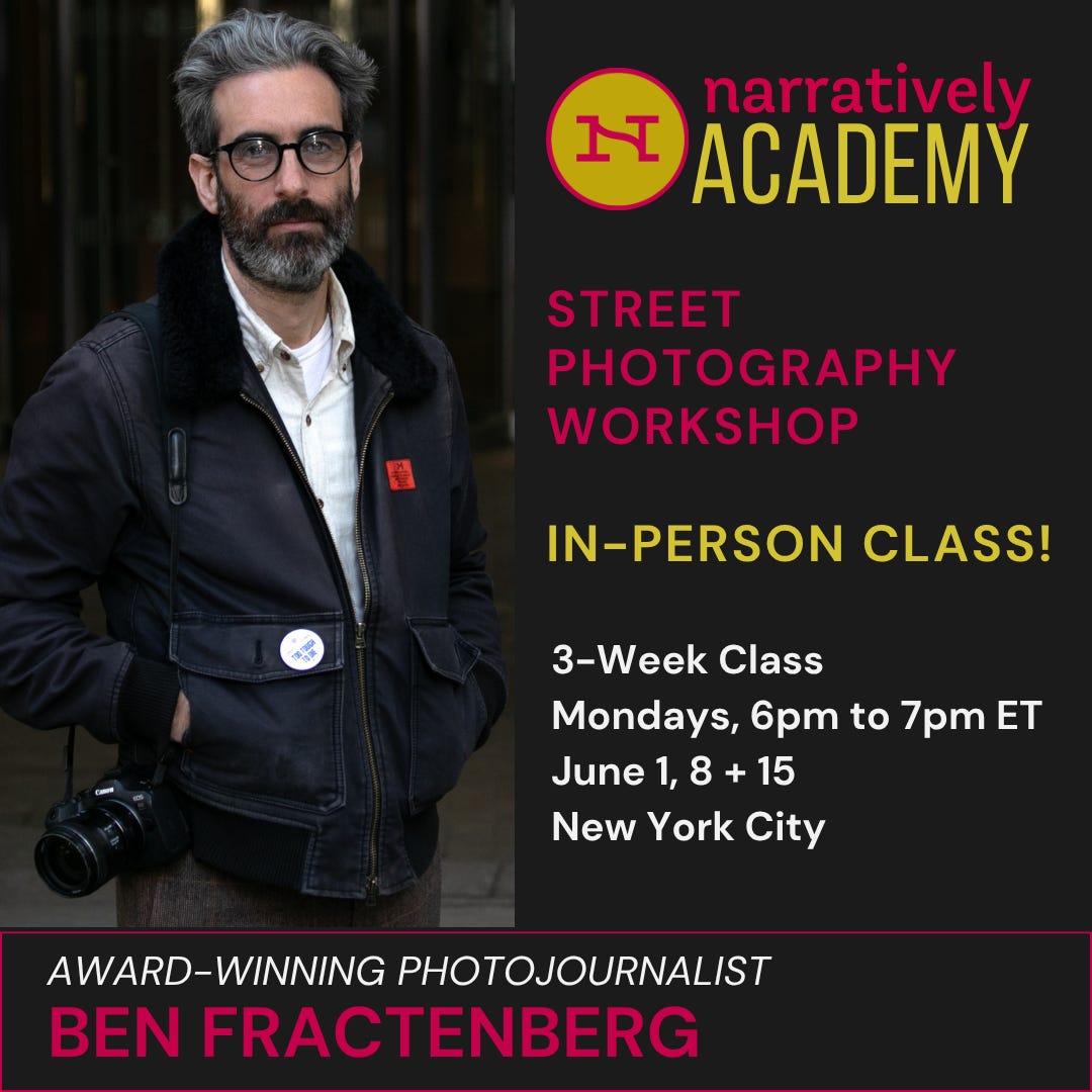 Whether you write memoir or reported stories, you know writers are increasingly relied on to take our own photos. But there’s a huge difference between a quick snap and a thoughtful, composed photo. That’s why we are so thrilled to offer our first-ever photography class. Award-winning photojournalist Ben Fractenberg has shot for The New York Times, Daily News and THE CITY, among other outlets. In this three-session hands-on workshop held in New York City, you’ll spend time out in the city shooting, then come back together to review, refine, and push your work further. Whether you’re brand new to street photography or looking to get more intentional about your practice, this class is about learning to see—and capture—the moments most people miss.