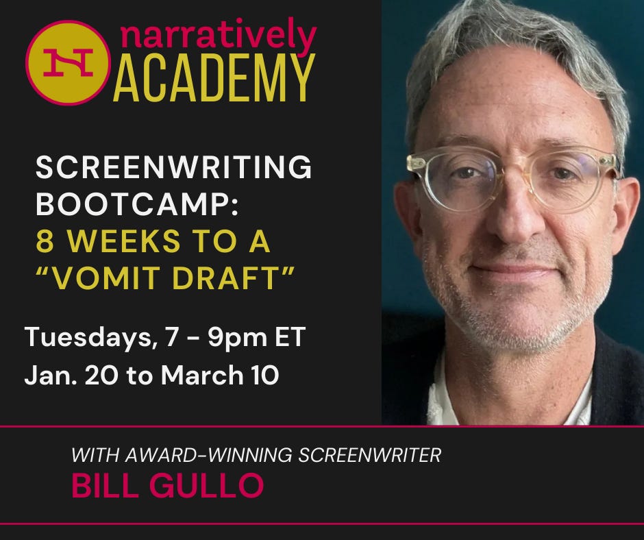 If you’re a journalist or essayist who has always wanted to try your hand at a screenplay, 2026 is your chance to commit. Bill Gullo is a very accomplished Hollywood screenwriter and longtime educator. In this fun, fast-paced class, he’ll show you how to write a “vomit draft” of a screenplay in eight weeks. What’s a vomit draft? It’s just what it sounds like: fast and disgusting, but productive. Plus, you’ll feel better after you’re done! Throughout these eight weeks, Bill will walk you through all the details of how to get that full first draft finished in a way that allows you to move forward with intention.