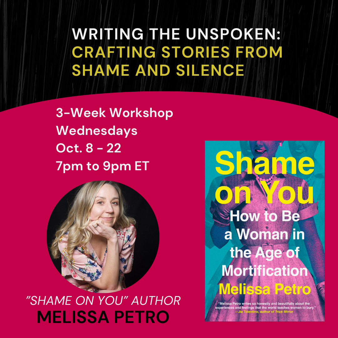 Melissa Petro’s critically acclaimed hybrid memoir, Shame on You: How to Be a Woman in the Age of Mortification is an incredibly moving book. We were honored to chat with her last month to learn more about how she wrote this book and landed a deal to get it published. And we’re even more excited that Melissa will be working with a small group of writers this month to help navigate how to tell their own stories in a three-part workshop, Writing the Unspoken: Crafting Stories from Shame and Silence.