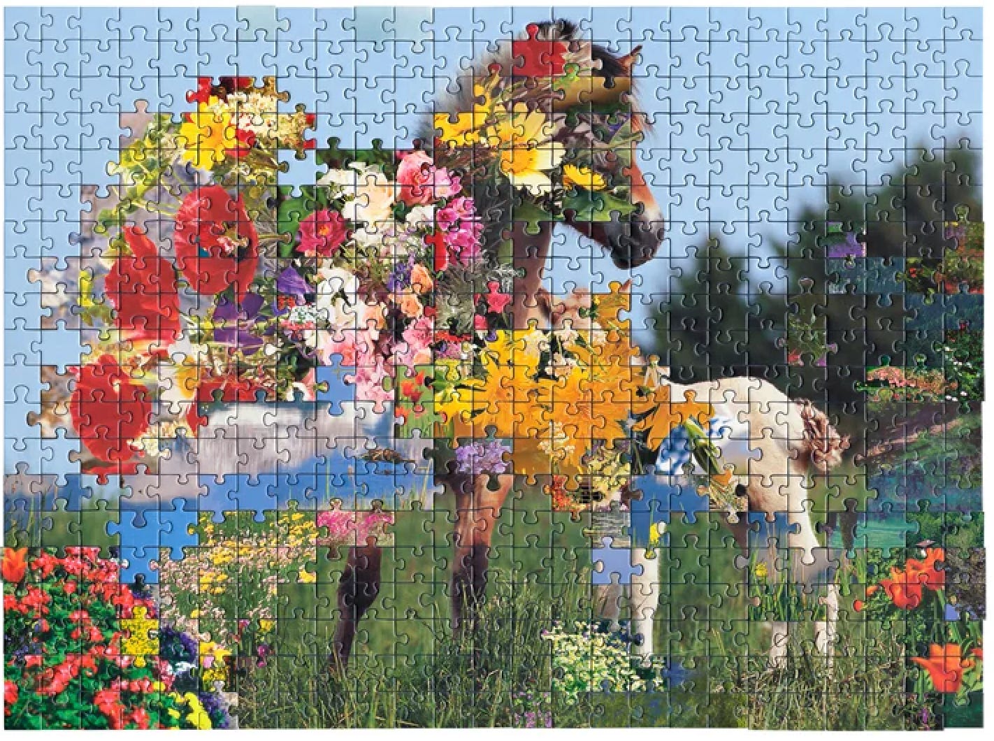 This idea applies to more than just narrative and performance. Kent Rogowski has a lovely and disorienting series where he combines different puzzle sets that have pieces with the same shape, turning two otherwise commonplace images — a horse, a bouquet of flowers — into something entirely new. The routine of looking at a horse is interrupted and we’re invited to experience it with fresh eyes.