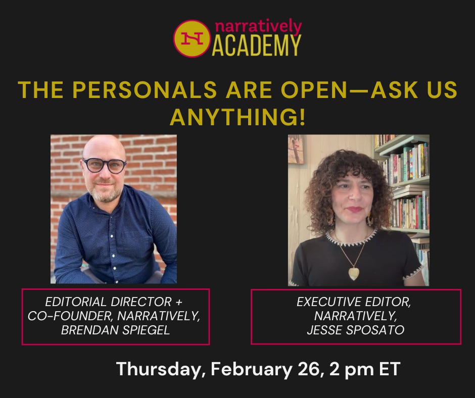 ICYMI, we recently opened up The Personals again—join us later this week to ask us any questions you might have about submitting to the series. Plus! last call for one of our fave classes and more…
