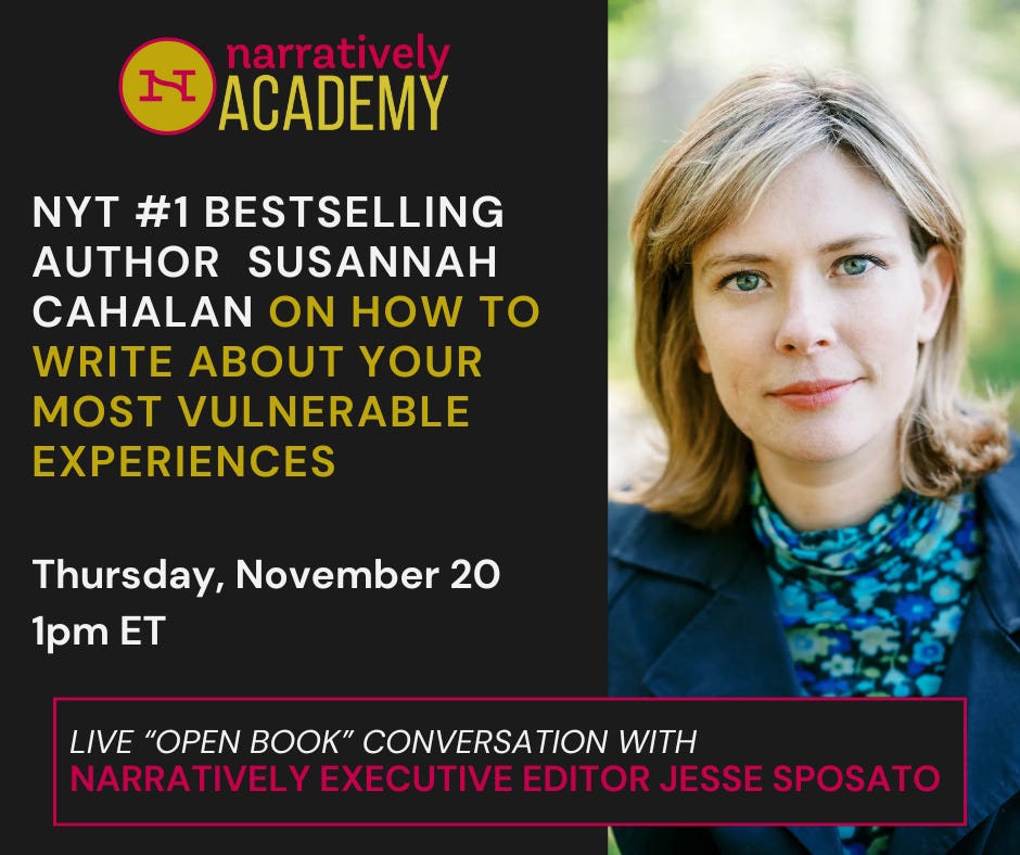 Narratively’s executive editor Jesse Sposato will interview Susannah about her writing career, how she got her memoir published and how she managed to write about the worst thing that’s ever happened to her — both emotionally, and technically since she lost a lot of her memory of it while she was sick. Plus we’ll take questions for Jesse and Susannah about what we’re looking for in submissions to the Narratively Memoir Prize and how to make your memoir sing.